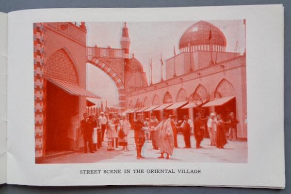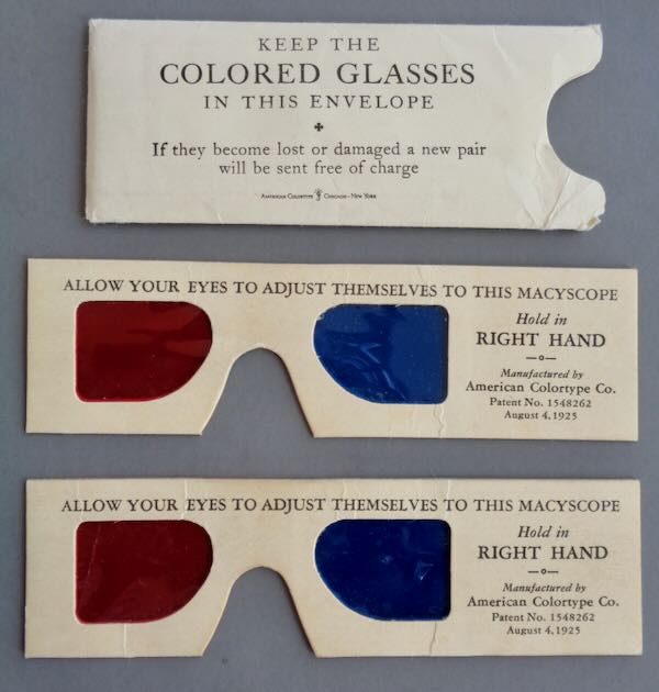 1933-34 Chicago World's Fair 3D view book, "Intimate Third-Dimension Views of a Century of Progress", "Chicago's 1933 and 34 World's Fair". Inside are 28 pictures (in a larger size than the 3D set in the box) that provide a 3D image of the fair buildings when you use the glasses that are provided with the booklet. 2 pairs of the glasses are provided. These are nice big pictures. Rare. Size: 8" wide by 5" high. Condition: Extremely Fine, a little paper loss from the bottom left corner of the cover and a small dent in one of the lens.