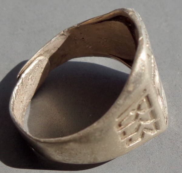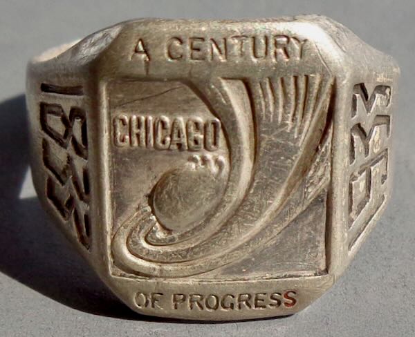 1933-34 Chicago World's Fair Sterling Silver Ring with the "Star of Arcturus" logo in a square design at the center with "Chicago" written to the left. Above is "A Century" and below "of Progress". Engraved on the left side is "1833" and on the right "1933." The band of the ring is adjustable. On the back of the face is "Robbins Co Attleboro Mass Sterling". Size: The face is 7/16" wide by 5/8" high. The opening is 3/4" diameter. Condition: Excellent.