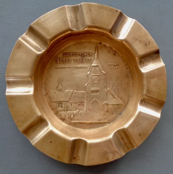 1933-34 Chicago World's Fair Copper Tray with embossed image of the "Cuckoo Tower", "Black Forest", "Century of Progress", "Chicago 1934". The image is the Clock tower with the surrounding building. Size: 4 3/8" diameter. Condition: Extremely Fine, a little polish will make it Excellent.