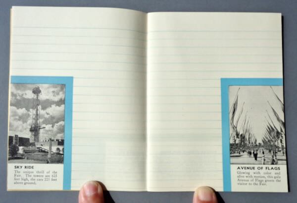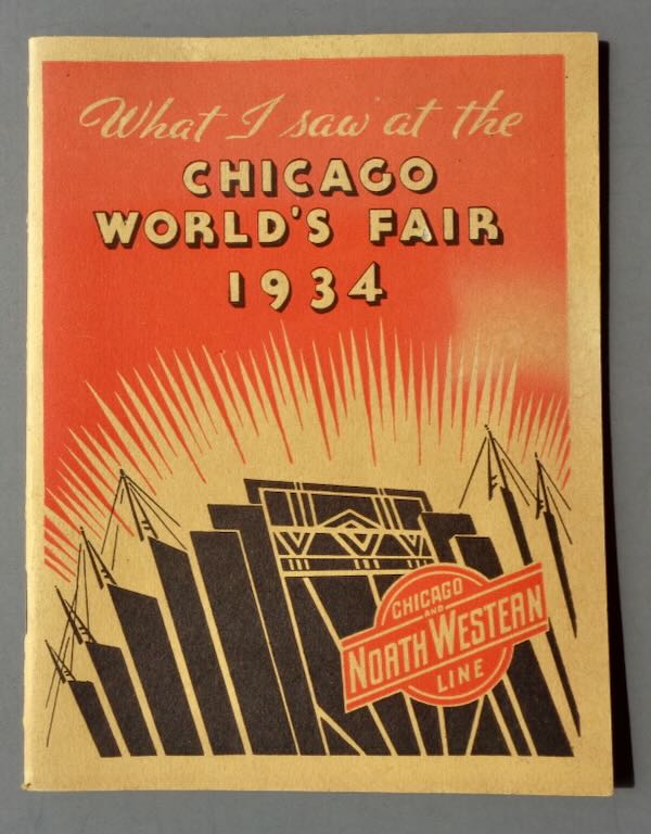 1933-34 Chicago World's Fair Booklet "What I saw at the Chicago World's Fair 1934" given away by "North Western" railroad. Inside are 32 pages, each with a picture of a fair building and space to write notes about your visit. Size: 4 3/8" wide by 5 3/4" high. Condition: Extremely Fine, the cover is a little soiled and the pages are slightly darkened.