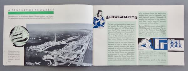 1933-34 Chicago World's Fair Booklet from the "Makers of Jack Frost Packaged Sugars", a "Souvenir of World's Fair Chicago 1933". Inside are 24 pages telling the "Story of Sugar". The first page pictures an aerial view of the fairgrounds with a mention of the Skyride. The rest of the booklet tells everything you need to know about the manufacturing of sugar. The inside back cover pictures the Jack Frost products in color. Size: 9" wide by 6" high. Condition: Fine, the back page has paper glued to it. The inside is nice and clean.