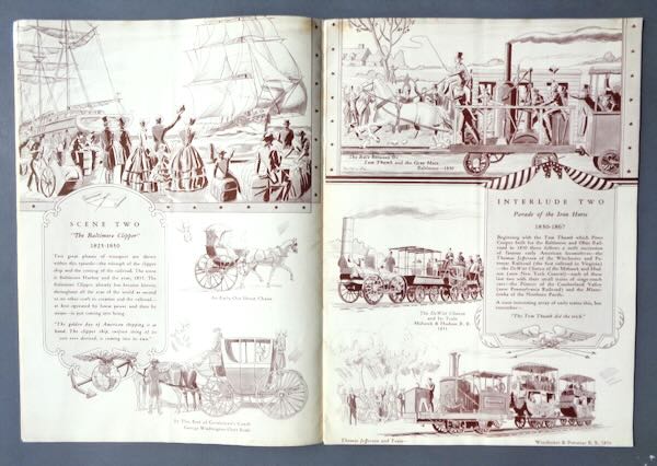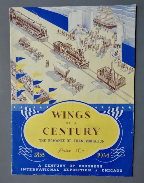 1933-34 Chicago World's Fair Program for the play "Wings of a Century, The Romance of Transportation". Inside is a short description of each "act" with a separate page containing the cast list. Inside are drawings of the different scenes. It is dated 1934. 16 pages including covers. Size: 8 1/2" wide by 11 1/2" high. Condition: Very Fine, a little wear on the spine and cover edges.