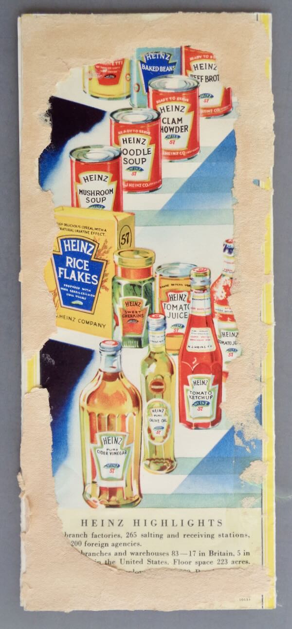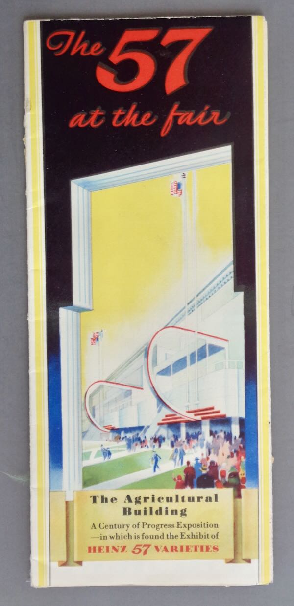 1933-34 Chicago World's Fair Folder for Heinz. "The 57 at the Fair", "The Agricultural Building", "A Century of Progress Exposition - in which is found the Exhibit of Heinz 57 Varieties". Open the folder up and it shows their exhibit "kitchens from many lands" and has a list of 57 of their products. Size: Closed: 3 3/4" wide by 8 3/4" high. Open: 14 3/4" wide by 17" high. Condition: Fair, there is a lot of paper residue on the back cover.