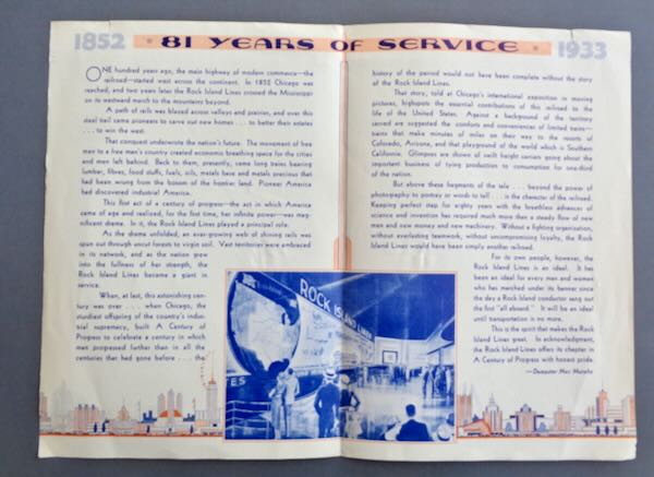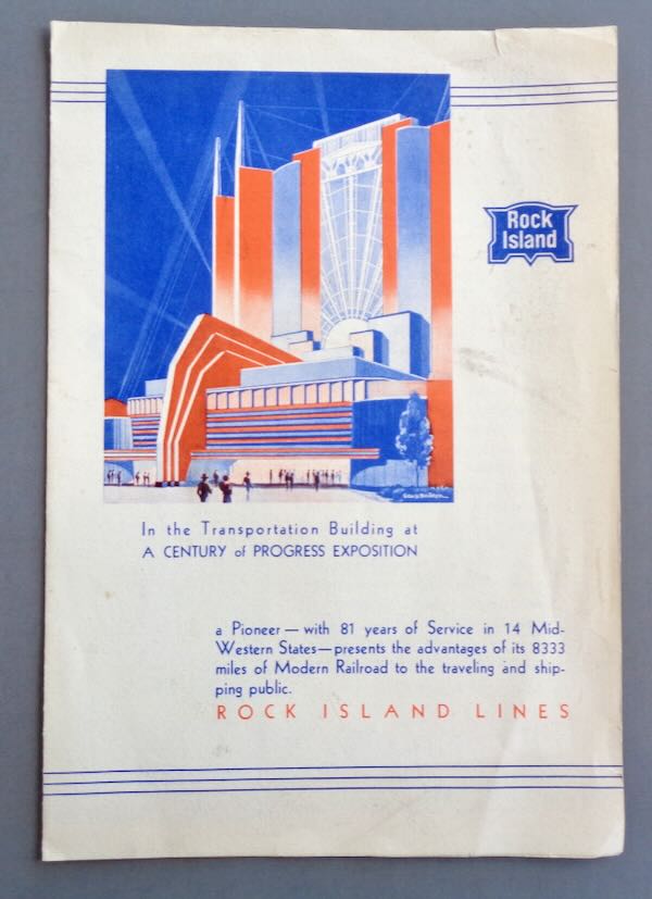 1933-34 Chicago World's Fair Folder from "Rock Island Lines" picturing a drawing in blue, orange and white of the "Transportation Building at A Century of Progress Exposition". Inside is "81 Years of Service" telling the story of the growth of railroads, a picture of their exhibit, a little about the exhibit and more. Size: 6 1/2" wide by 9 3/8" high. Condition: Very Good. There is a 1/4" tear at the top of the front and back page. There is light soiling and a spot on the back.